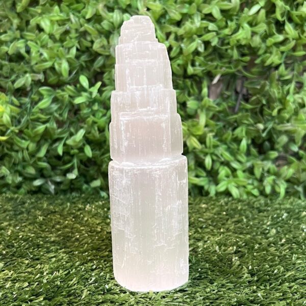 Selenita é considerada um cristal de limpeza e purificação. Com o formato de torre fica lindo para decorar e harmonizar ambientes.